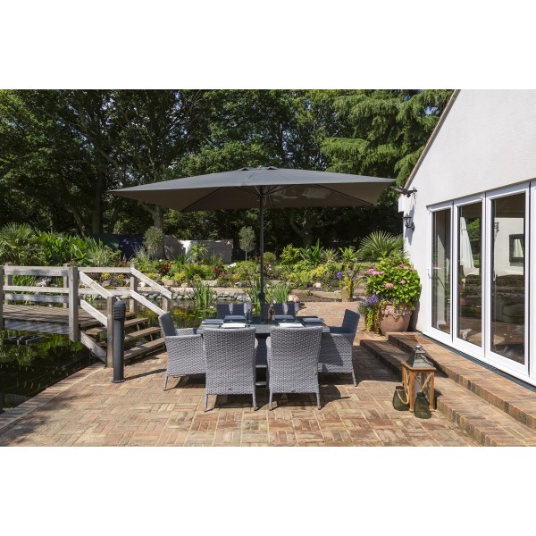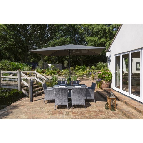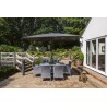 Tabletop has easy clean tempered glass for added safety. There's a hole in the middle of the table, where you can place the 3m x 2m Sturdi polished aluminium parasol with easy use crank.