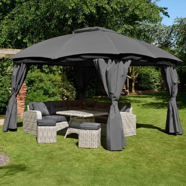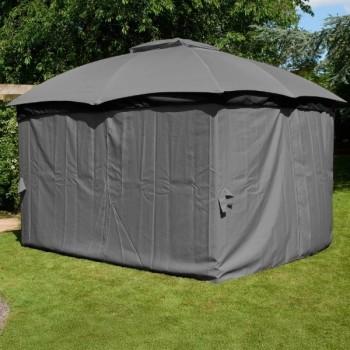 Build a personal retreat from the sun with this stylish Rio Grey Garden Gazebo, an ornate, strong shelter that has a dome-style roof canopy with a raised air vent for plenty of air circulation. Features four sturdy powder-coated steel columns that support the decorative edged roof, which consists of screws instead of rivets, making this gazebo quick to assemble and dismantle. A durable PVC-coated showerproof polyester roof cover and curtains (with tie-backs) provide a covered area. this gazebo will look effortlessly elegant in your garden all year round. Simply remove the roof cover and curtains when not in use in the winter months.