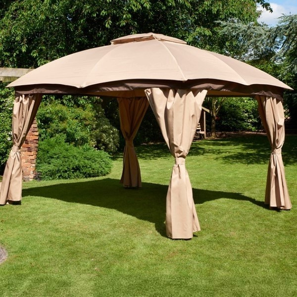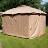 This strong steel framed gazebo that features a dome style roof canopy with fluted edges and a raised vent that allows for plenty of air circulation. There are four, sturdy, powder coated steel columns that support the decorative edged roof which consists of screws instead of rivets, therefore helping to make this product easy to assemble and disassemble for storing, whilst retaining the gazebos strength and stability once secured into the ground or decking with the pre-drilled fixing plates. A durable, PVC coated polyester roof cover and curtains (with tie backs) that are showerproof are included in a warm Mocha colour.